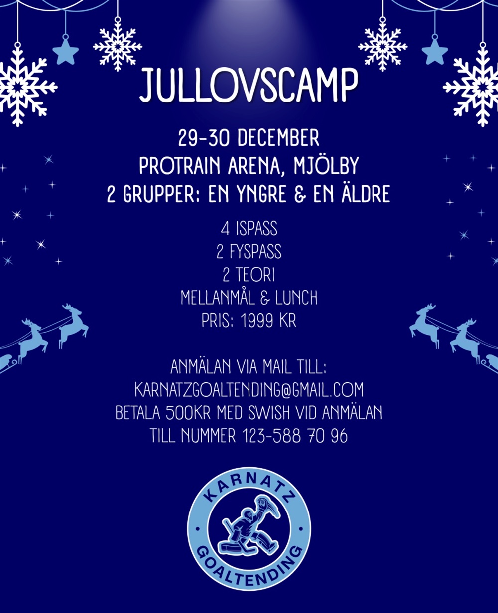 Efter en väldigt lyckad höstlovscamp så bjuder nu Karnatz Goaltending in dig som är målvakt i Mjölby HC till målvaktscamp på jullovet! Campen genomförs i just Mjölby den 29-30 december och dagarna sträcker sig mellan ca kl 08-16. Utöver mig kommer det även vara fler erfarna målvaktstränare som ser till att du får mycket feedback och har utvecklande dagar. Vi kommer ge dig nya verktyg inom skridskoteknik, räddningsteknik och speluppfattning. Åldrar för campen är målvakter från U11 och uppåt som kommer delas in i två grupper, en yngre och en äldre. Campen innehåller följande: 4 ispass 2 fyspass 2 teori Lunch och mellanmål båda dagar Pris: 1999 kr Anmäl er genom att skicka mail till karnatzgoaltending@gmail.com och swisha 500 kr till nummer 123-588 70 96. Denna summa på 500 fungerar som en anmälningsavgift som inte går att få tillbaka vid avanmälan. Resterande del av campavgiften betalas senast 20 december (obs det går att betala hela beloppet direkt). I anmälningsmailet anger ni namn, ålder, lag, allergier och storlek på målvaktsträningströja. Följ också Karnatz Goaltending på instagram eller facebook för uppdateringar om mina aktiviteter! Hör av er om ni har några frågor. Ses på isen!