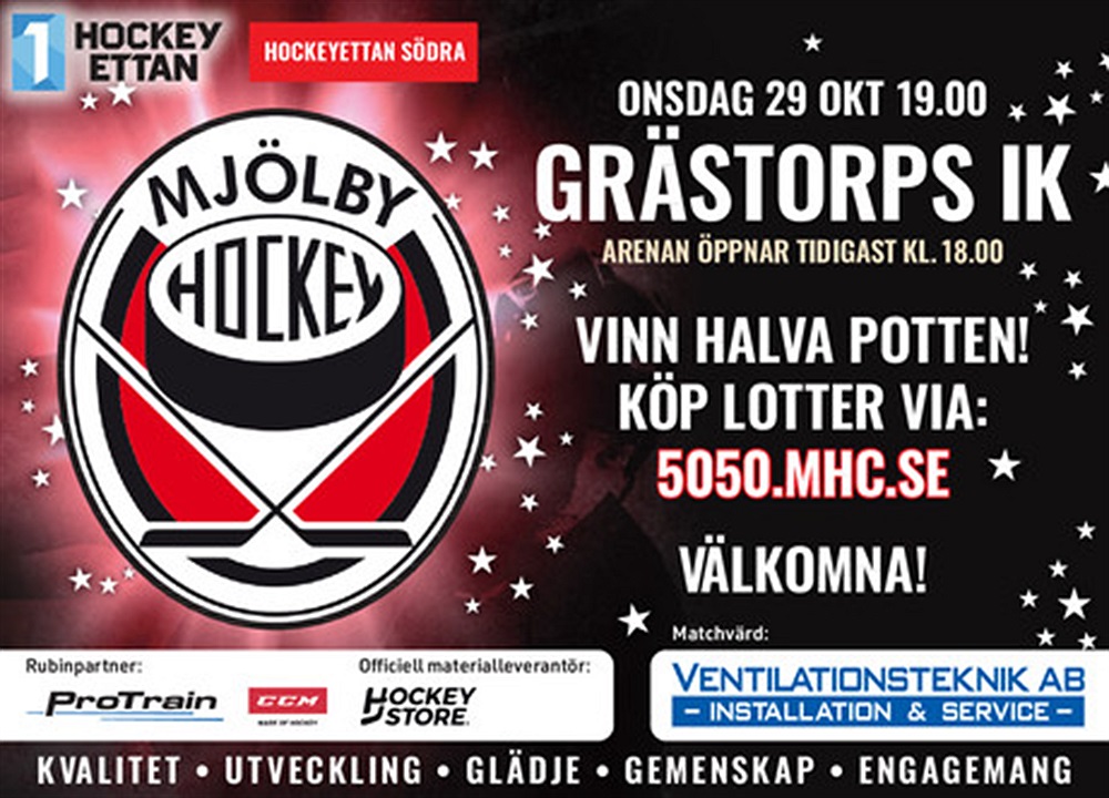 Först bortamatch mor Mörrum nu på lördag, som du kan se genom abonnemang på Hockeyettan Play (Subscribe – Hockeyettan). Sedan två matcher i ProTrain Arena: onsdag 29 oktober Grästorp kl. 19 och lördag 1 nov DERBY mot Tranås kl. 16. Då visar även Vargligan upp sig i en paus! 5050 finns redan nu ute till Grästorps matchen! Var med och vinn halva potten och stöd ditt MHC samtidigt! Mjölby Hockey | 50/50-lotter